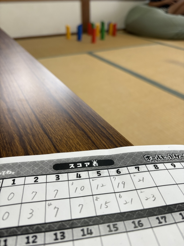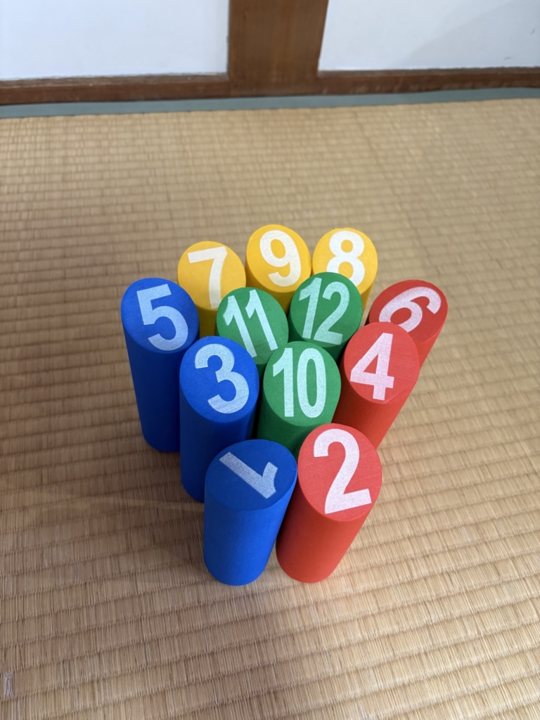 チーム戦で、数字が書いてある棒をスティックを投げて倒し50点獲得した方が勝ちで、1本だと書いてある数が得点、2本以上は倒した本数が得点に