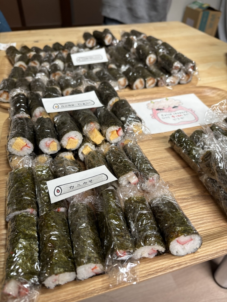 小さい子でも食べやすいように細巻きを3等分にして、カツ・ツナマヨ・カニカマたまごの3種類の中から好きなものを選んでもらいました(^^)